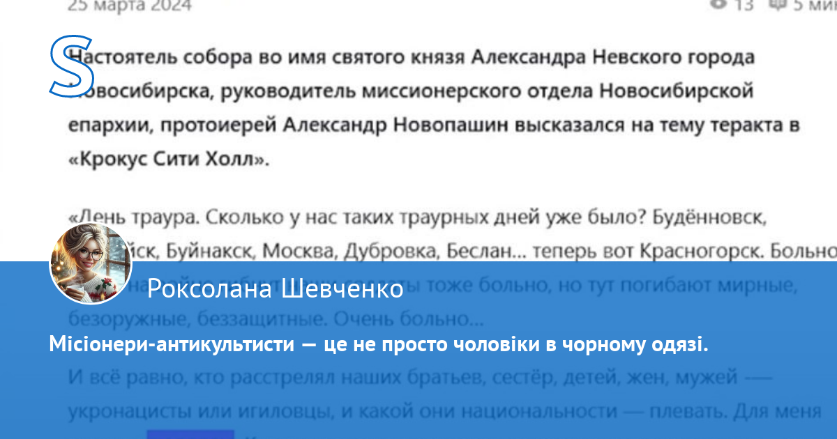 Нагадаю, що це той самий Новопашин, який називав українців нацистами, сатаністами і навіть людожерами. Нагадаю також, що сайт місіонерського відділу Новосибірської єпархії РПЦ, протоієрея Олександра Новопашина — другий за значущістю сайт РАЦІРС. Саме на ньому у 2022 році був опублікований і досі розміщений документ під назвою «Довідник для громадян України з організації громадянського спротиву київському маріонетковому уряду». Ця методичка по суті є практичним посібником із проведення диверсій в Україні під час вторгнення російської армії — пряме керівництво до дії у воєнний час. І той факт, що цей інформаційний продукт просував офіційний сайт РАЦІРС, ще більше переконує у розумінні: місіонери-антикультисти — це не просто чоловіки в чорних сутанах. Це солдати, адепти, агенти на службі у свого хазяїна. Хто їх хазяїн — їм краще знати. Але до Бога це не має жодного відношення.