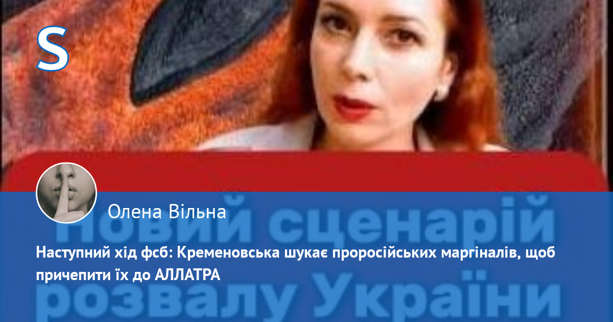 Вона буде намагатися «прикрутити» до «АЛЛАТРА» будь-кого, хто ніколи не був волонтером АЛЛАТРА. Кременовська вишукує лояльних до рашки, бо сама служить рашці та фсб, й буде писати у своїх фейкових експертизах, що це — волонтери АЛЛАТРА. Так вона намагається розхитати ще більше Україну, направити одних людей проти інших, приховуючи, що все це робить лише для того, щоб рашка повністю заволоділа Україною!