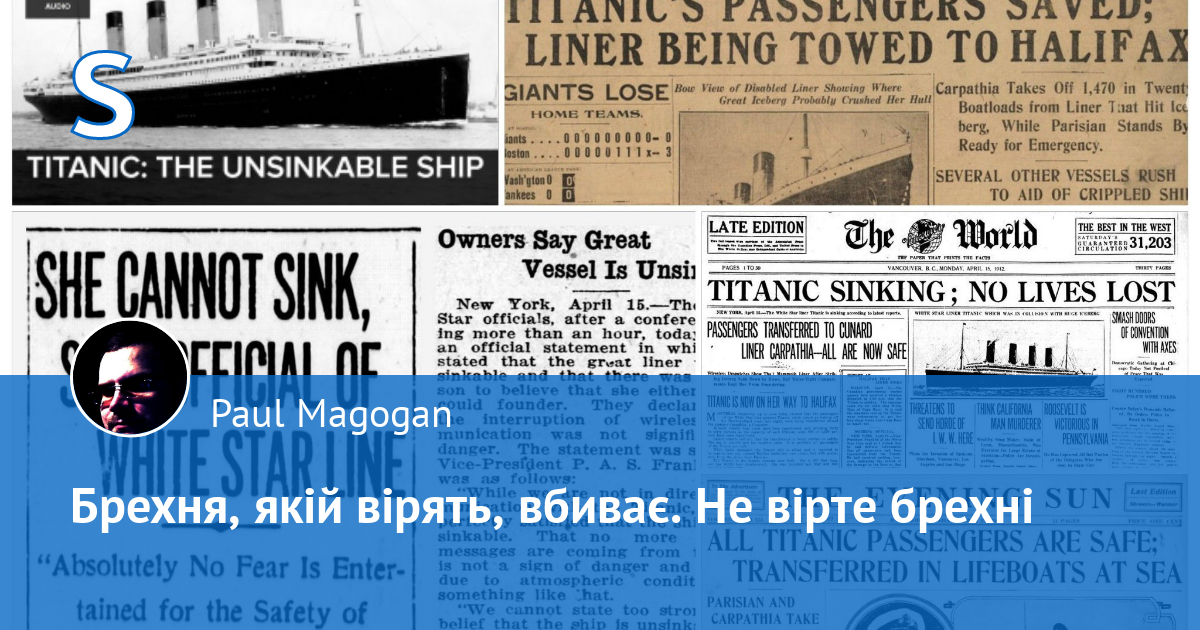 Від пасажирів Титаніка, які повірили, що він не може потонути, залишились тільки чоботи й залишки одягу на дні Атлантичного океану. Хрестоматійним прикладом є газетні повідомлення: «Катастрофа Титаніка: ніхто не загинув», «Він не може затонути», «Усі пасажири врятовані, лайнер буксирують у Галіфакс».