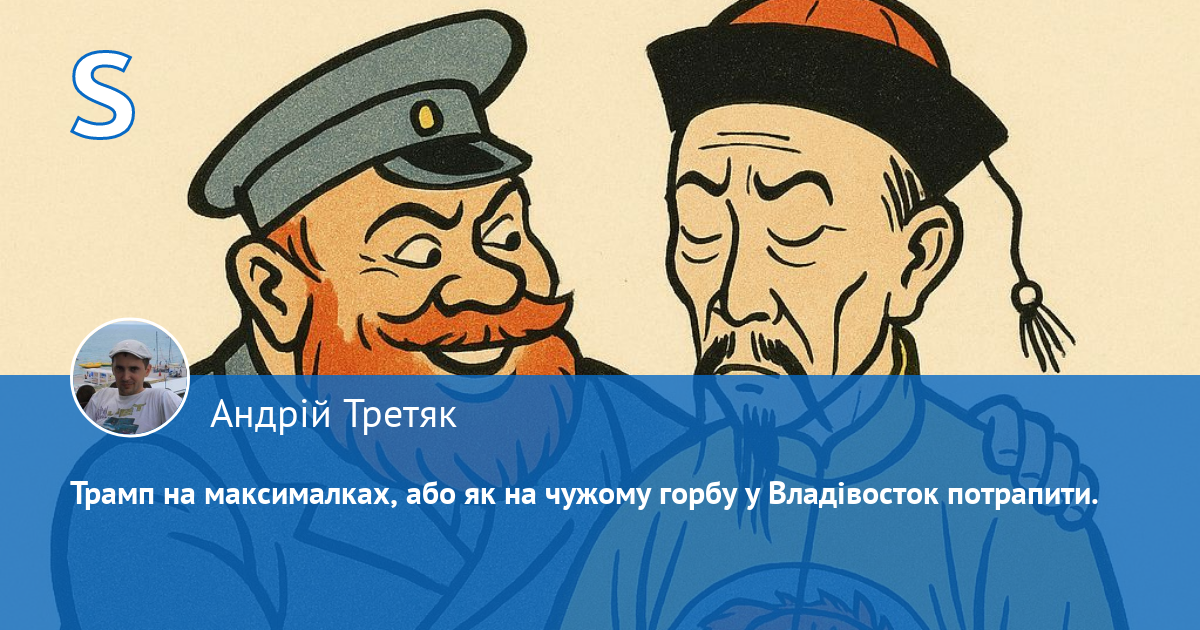 І тут на арені у червоні кепці MAGA (Make Amur Great Again) з'являється Микола Ігнатьєв — спеціальний представник російського імператора Олександра ІІ. І сходу пропонує всім піс діл. Peace deal тобто. Без постів капсом у Твіттері, просто обіцяє добряче загорівшим вже європейцям організувати безпечний трансфер трофейних ваз з Пекіна до узбережжя, а китайцям заповітне припинення вторгнення на умовах, на яких вони, в принципі, й самі з агресором домовитися могли. А за посередництво що? Ну чистий дріб'язок. За витрачені нерви, децл землі на додачу до тої, що росія вже хапнула за Айгунським договором. Дальнє рибальське узбережжя на південь від Амуру з бухтою морських огірків Хайшеньвей. Там все одно нічого, окрім засраного чайками каміння, немає. Все по-братськи. Ну, що, по рукам? У вас, я бачу, й карт нема.