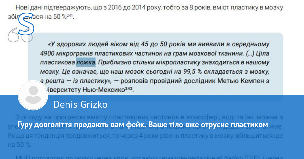 Цитата «Пластикові частинки, завдяки своїм невеликим розмірам, здатні долати біологічні бар„єри, викликаючи окислювальний стрес, пошкодження ДНК, запальні реакції та порушення клітинних функцій“.