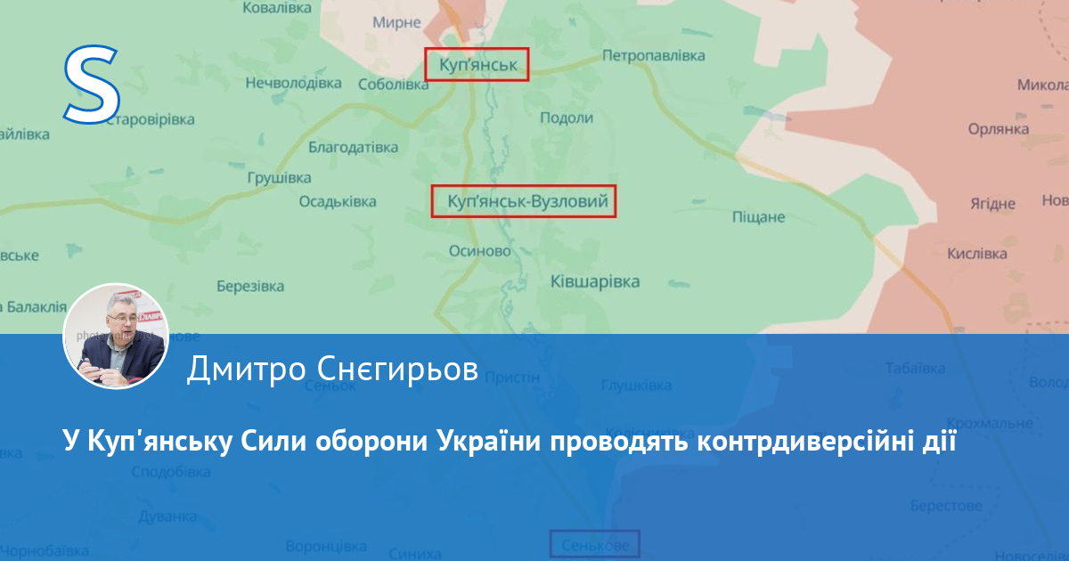 У Куп'янську Сили оборони України проводять контрдиверсійні дії для подальшого пошуку штурмових груп окупантів і знищення їхнього особового складу. Важкі бої йдуть на околиці Куп'янська, але не в центрі. Причому, слід зазначити, росіяни штучно дають інформацію щодо Куп'янська, відволікаючи увагу від Куп'янська-Вузлового, який є ключовою метою російських військ. Контроль над цією залізничною станцією є стратегічним завданням російських окупантів. Саме за рахунок залізниці вони намагаються поліпшити логістику власних військ на Харківському напрямку з метою формування ударного угруповання, яке вздовж річки Оскіл просуватиметься в напрямку Слов'янсько-Краматорської агломерації.