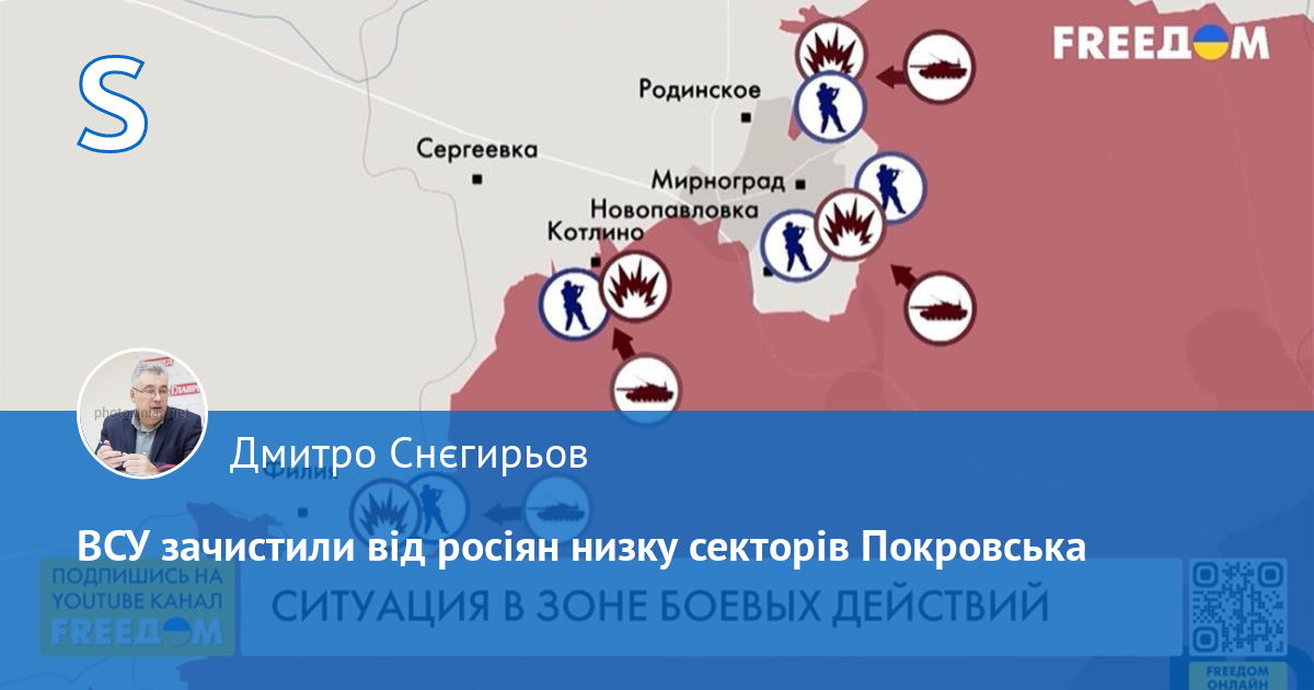 «Ми також зайняли бойові позиції в ряді секторів самого Покровська, в тому числі на південному напрямку міста. Сили спеціальних операцій проводять зачистки цих секторів у місті. Також ми посилили позиції на флангах, особливо на південному напрямку. Більш активно ведемо роботу і з півночі, де ворог до цього намагався зайти в Покровськ. Тому зараз перспектив захоплення міста немає, тривають бої. Ми б'ємо по їх логістиці. Якраз у прифронтових зонах, де ворог намагається наростити ресурси для атак, провели ряд ударів по бронетехніці, яка готувалася для просування в Покровськ», — розповів генерал армії України, керівник Служби зовнішньої розвідки України (2005-2010 рр.) Микола Маломуж.