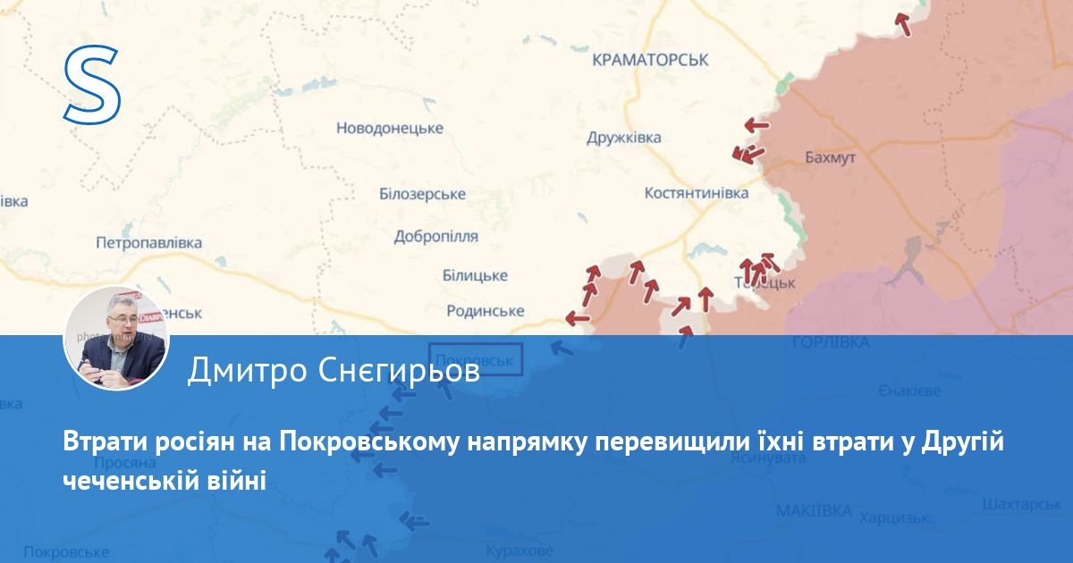 З початку наступальної операції російських військ на Покровському напрямку Донецької області, за даними Головного управління розвідки Міноборони України, втрати росіян порівнянні з кількістю особового складу Західного військового округу армії РФ. А місячне число вбитими перевищує втрати росіян за весь період їх Другої Чеченської війни.
