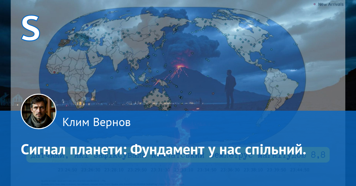 Землетрус магнітудою 8,8, епіцентр якого знаходився за 150 км від Петропавловська-Камчатського, спричинив цунамі, що дісталося Японії та Гаваїв. У Північнокурильську евакуювали мешканців, у Петропавловську пошкоджено дитячий садок і поліклініку. За добу зафіксовано понад 170 афтершоків, вісім з них перевищували 6 балів. Це не кінець, а початок.Планета не мозаїка ізольованих зон. Це мережа тектонічних плит, де напруга в одній точці відгукується у всій системі. Камчатка лише перша тріщина у фундаменті, що з'єднує нас усіх.