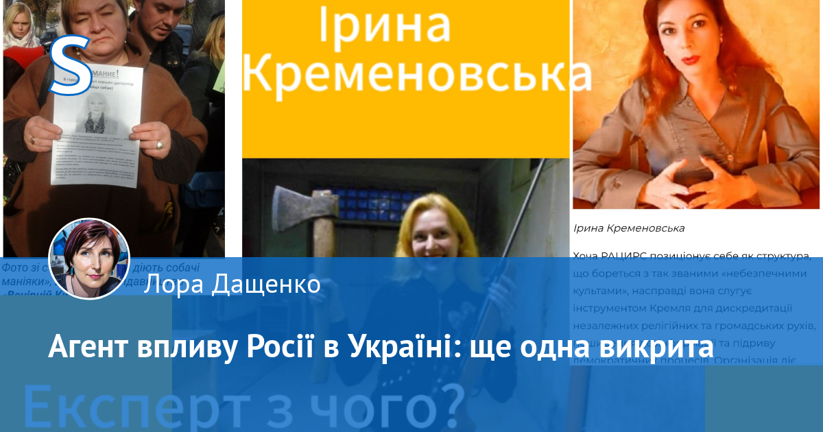 Але це ще не все! Вгадайте, хто в Україні протеже Новопашина, кого він вихваляє? Отаку собі «панну» Ірину Кременовську, яка називає себе «борцем із сектами». На ділі вона — агент РАЦИРС, що топче за Московський патріархат і таврує всі інші конфесії. Дворкін сам проговорився, що в нього є «контакти» в Україні, і, схоже, Кременовська — головна з них. Роками ця жінка підривала нашу державність, дегуманізувала українців і, ймовірно, зливала інформацію ворогові. Сайти і групи що вона керує під видом різної діяльності насправді прикривають тісну взаємодію з РАЦИРС і сприяють підриву основ Української громадсьості: