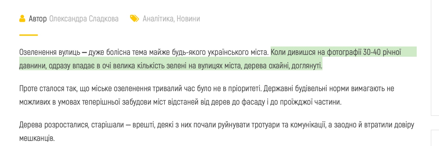 "Озеленення вулиць – дуже болісна тема майже будь-якого" українського міста. Коли дивишся на фотографії 30-40 річної давнини одразу впадає в очі велика кількість зелені на вулицях міста, дерева охайні, доглянуті. Проте сталося так, що міське озеленення тривалий час було не в пріоритеті. Державні будівельні норми вимагають не можливих в умовах теперішньої забудови міст відстаней від дерев до фасаду і до проїжджої частини. Дерева розросталися, старішали – врешті, деякі з них почали руйнувати тротуари та комунікації, а заодно втратили довіру мешканців"…