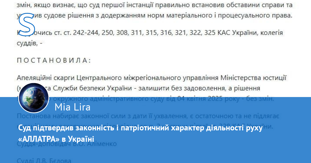 25 лютого 2026 року Шостий апеляційний адміністративний суд Києва постановою у справі № 640/362/23 підтвердив законність діяльності Громадського союзу «Міжнародний громадський рух „АЛЛАТРА“, залишивши без задоволення апеляційні скарги Центрального міжрегіонального управління Міністерства юстиції України та Служби безпеки України за позовом про заборону та примусову ліквідацію громадського об'єднання.