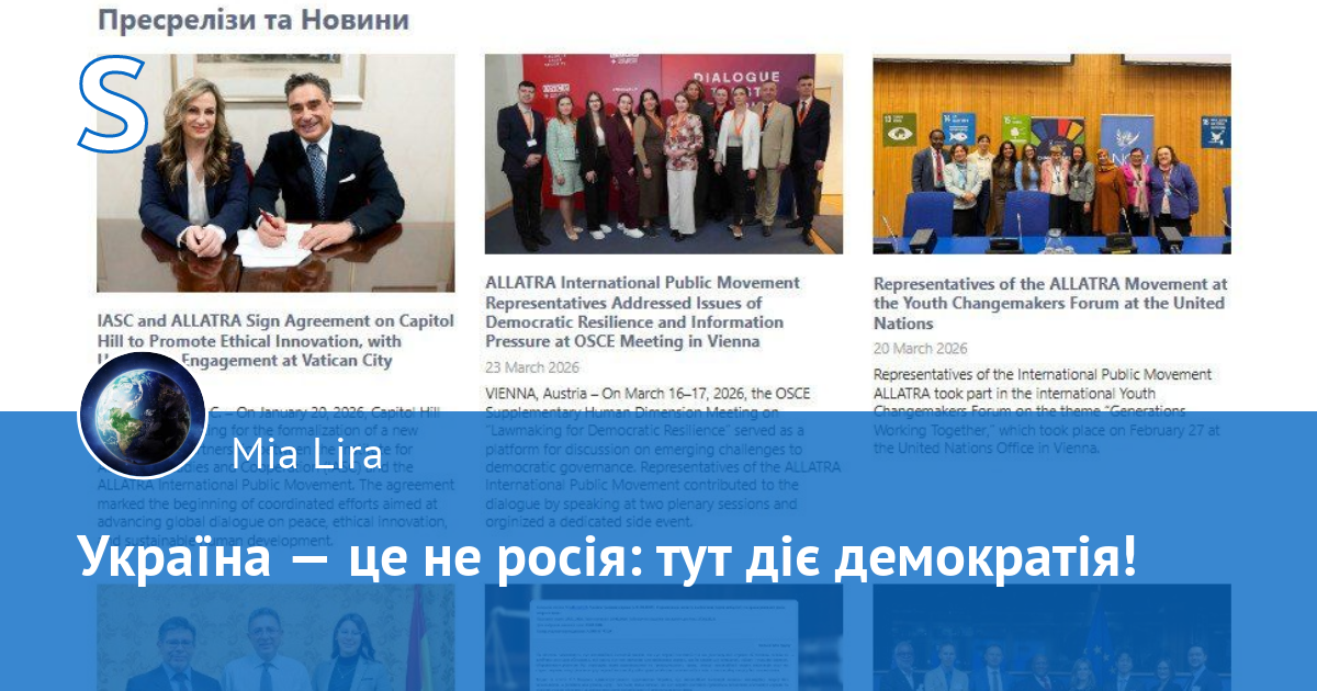 діяльність в Україні. Волонтери АЛЛАТРА допомагають в Україні тим, що привертають міжнародну увагу до нашої країни через наукові конференції, дослідження та суспільні проекти. Вони створюють інформаційні ініціативи, фільми та міжнародні дискусії, де привертають увагу світу до України і глобальних проблем. Фактично, це люди, які через міжнародну діяльність формують підтримку України та її голос у світі.