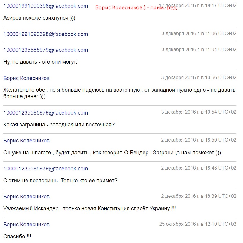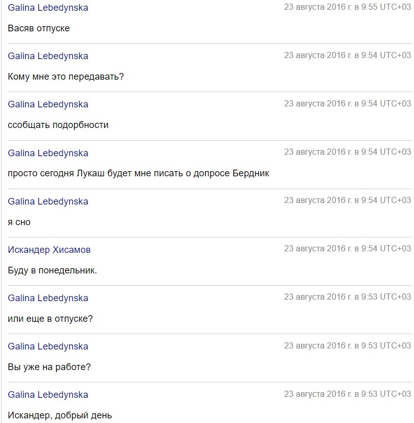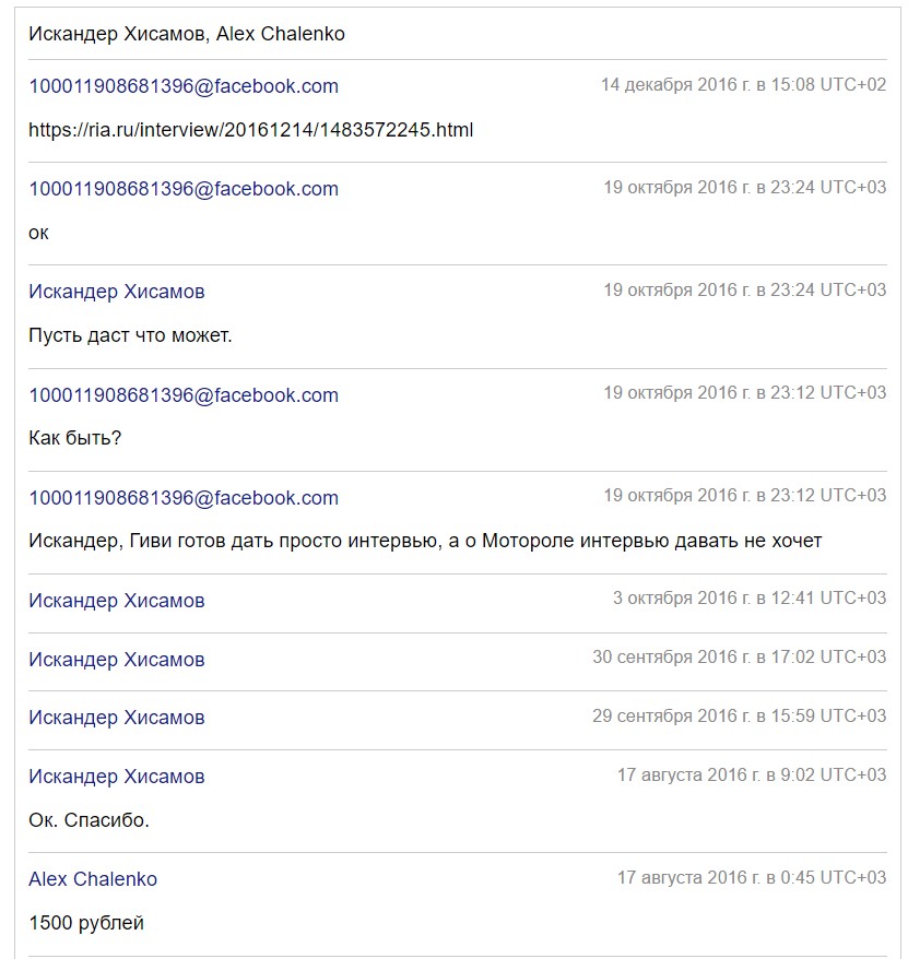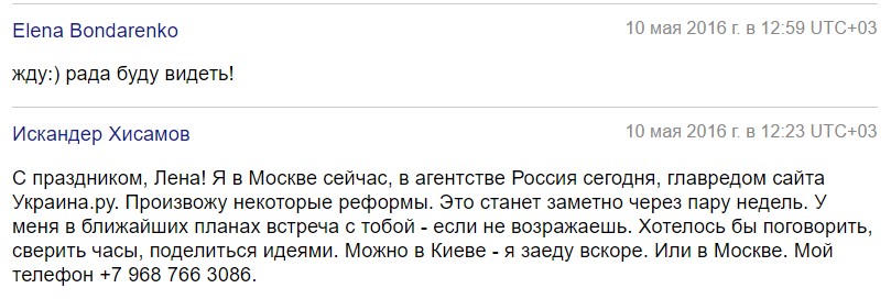 Переписка с женой Хисамова Светланой. Она как и муж имеют доступ к сайту СТРАНА.ua, который транслирует пропаганду кремля в украинское информационное поле.