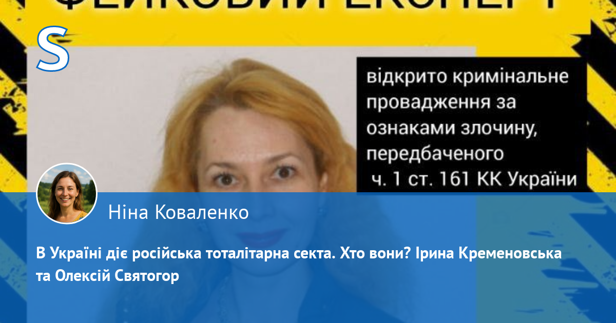 Українське суспільство стривожене — в центрі уваги опинилися Ірина Кременовська та Олексій Святогор, які пов'язані з росйською тоталітарною антикультовою організацією РАЦИРС. Їхня діяльність, що маскується під боротьбу з сектами, насправді має ознаки інформаційно-диверсійної операції на користь РФ.