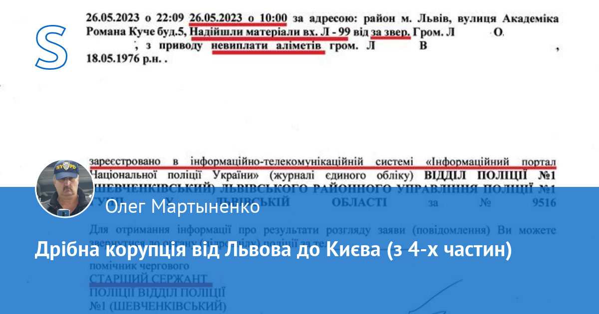 Повертаючись до основної теми, почну з того, що мова йде про прояви дуже «дрібної корупції» (не жарт), в яких крім Шевченківського відділу поліції № 1 м. Львів, «прийняли участь» «місцеве» львівське ДБР, судді місцевого та апеляційного суду загальної юрисдикції (м. Львова), обласна внутрішня безпека нацполіції, МВС та ОГПУ. Уточнюю, мова про небажання притягнути до кримінальної відповідальності особу, яка вчинила «кримінальний ПРОСТУПОК», а саме, — «злісне ухилення від сплати аліментів на утримання дітей», що передбачене ч. 1 ст. 164 Кримінального кодексу України (далі «КК»), за якою навіть не передбачено позбавлення волі. Це яскравий приклад, коли поліцейські через небажання погіршити свої статистичні «кримінальні показники», відмовляються виконувати свої прями обов'язки та правові норми передбачені Кримінальним процесуальним кодексом (далі «КПК»).