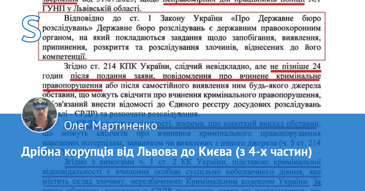 Через відверту та очевидну наявність в діях керівників та інших поліцейських зазначеного вище підрозділу поліції Львівщини, ознак кримінальних правопорушень передбачених ч. 1 ст. 366 та ч. 2 ст. 382 КК України, мною була подана відповідна заява про кримінальне правопорушення до ТУ ДБР у м. Львів. Нижче витяг з неї.