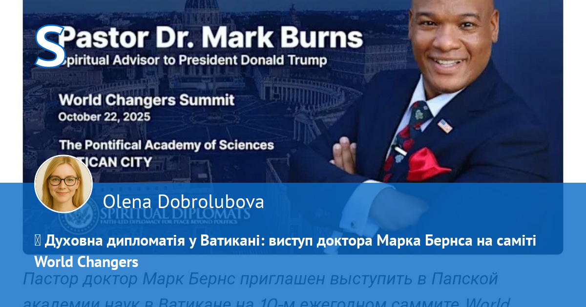 Пастор доктор Марк Бернс, головний духовний дипломат із питань глобального миру та духовний радник президента США Дональда Дж. Трампа, отримав офіційне запрошення виступити на 10-му щорічному саміті World Changers, який відбудеться з 20 по 22 жовтня 2025 року у Папській академії наук у Ватикані.