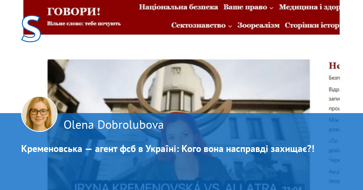 Придивіться уважно як Кременовська труїть АЛЛАТРА — організацію, що на вищому світовому рівні викриває діяльність антикультової мережі РАЦИРС. У своїй писульці, Кременовська без жодного доказу приписує невідомих людей, які начебто, за словами Кременовської підтримують рашку, й приписує їх до АЛЛАТРА. Ось реально розібравши її статтю чесно, не зрозуміло до чого тут АЛЛАТРА.