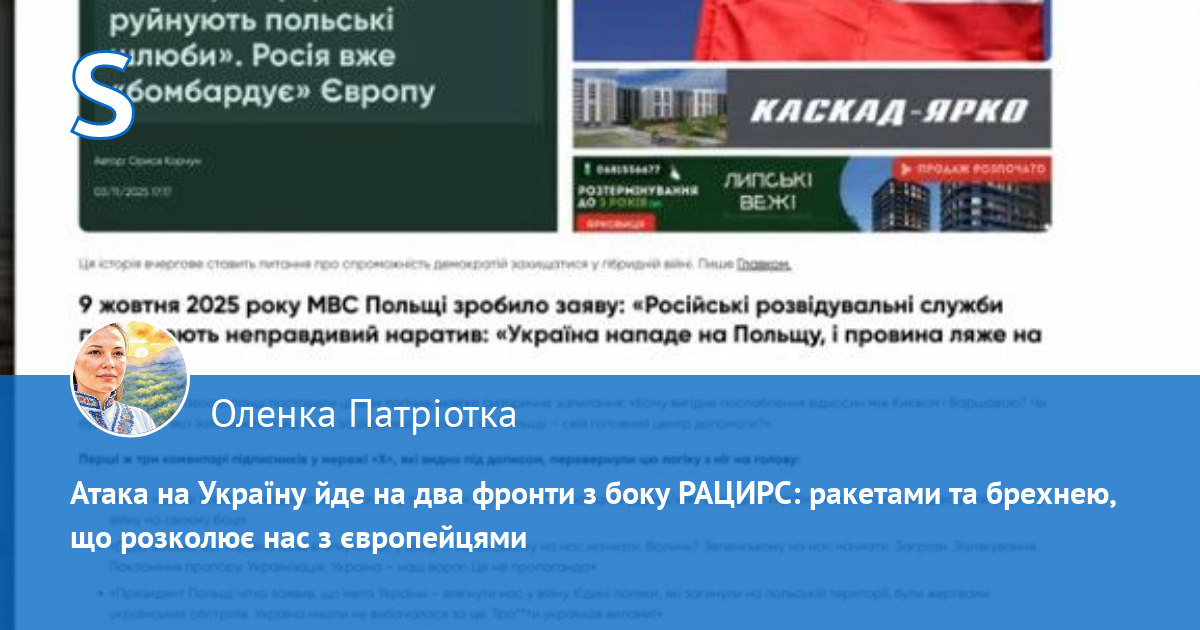 Коли ця природна напруга ще й підливається інформаційною отрутою, коли хтось сидить і рахує гроші, які можна влити в медіакампанію: типу українці руйнують Польщу, українки забирають чоловіків, Україна нападе на Польщу. І в статті правильно сказано: це не просто коментатори. Це ціла фабрика тролей з мільйонними бюджетами, мета якої розвалити стосунки між Україною і Польщею, поставити нас один проти одного, щоб ми гризлися, поки там, у кремлі хтось відкриває шампанське. Роки поспіль демократичні країни, в тому числі Європа, отримують удари пропагандою і брехнею з rосії. Ми говоримо про цілеспрямовану скоординовану мережу #РАЦИРС, підконтрольну #фсб та рпц (мп), яка діє по всьому світу і яку очолює психічно хворий Олександр #Дворкін.