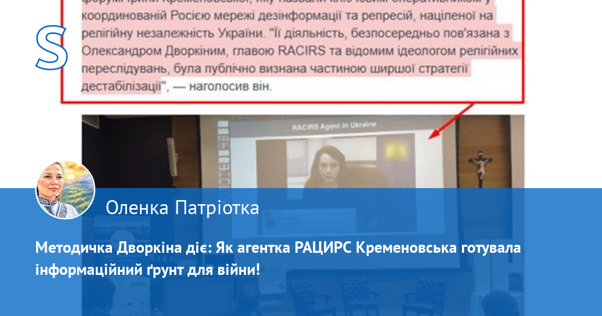 Фактично, Кременовська просуває наративи фсб в Україні, тому що Дворкін і його агенти РАЦИРС є підрозділом фсб.