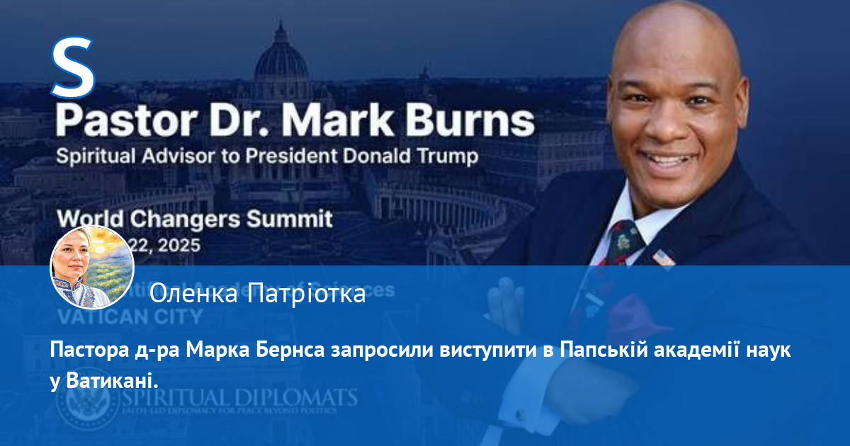 Офіс пастора Марка Бернса, головного духовного дипломата з питань глобального миру й духовного радника президента США Дональда Трампа, з гордістю повідомляє, що д-ра Бернса запросили виступити в Папській академії наук у Ватикані.