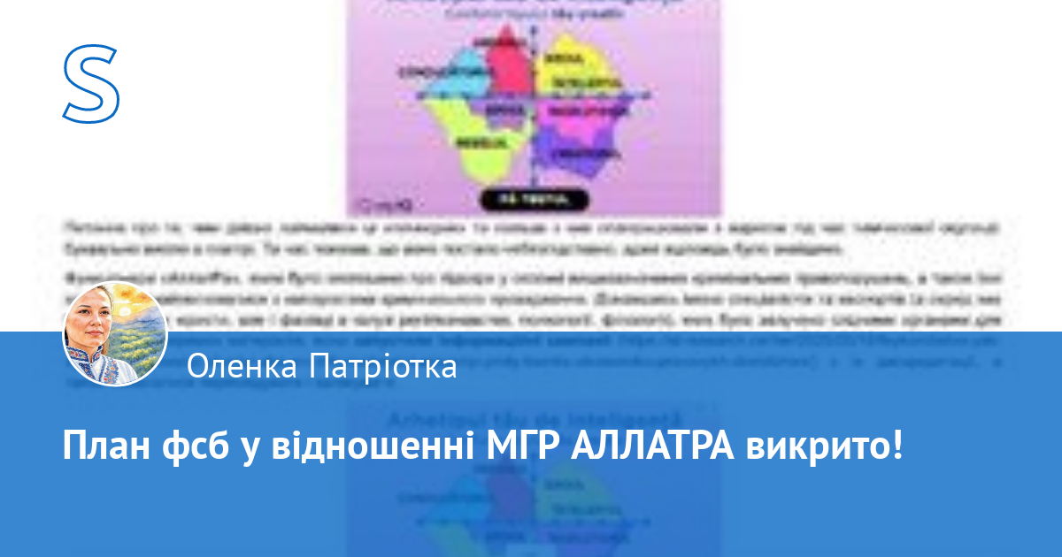 Кременовська готує масове фальсифіковане звинувачення української патріотичної організації у «проросійськості». Її мета — знищити довіру до МГР АЛЛАТРА, яка несе позитивний образ України у світі, та показати нашу державу як «нестабільну» та «проросійську». Це — частина гібридної війни фсб!