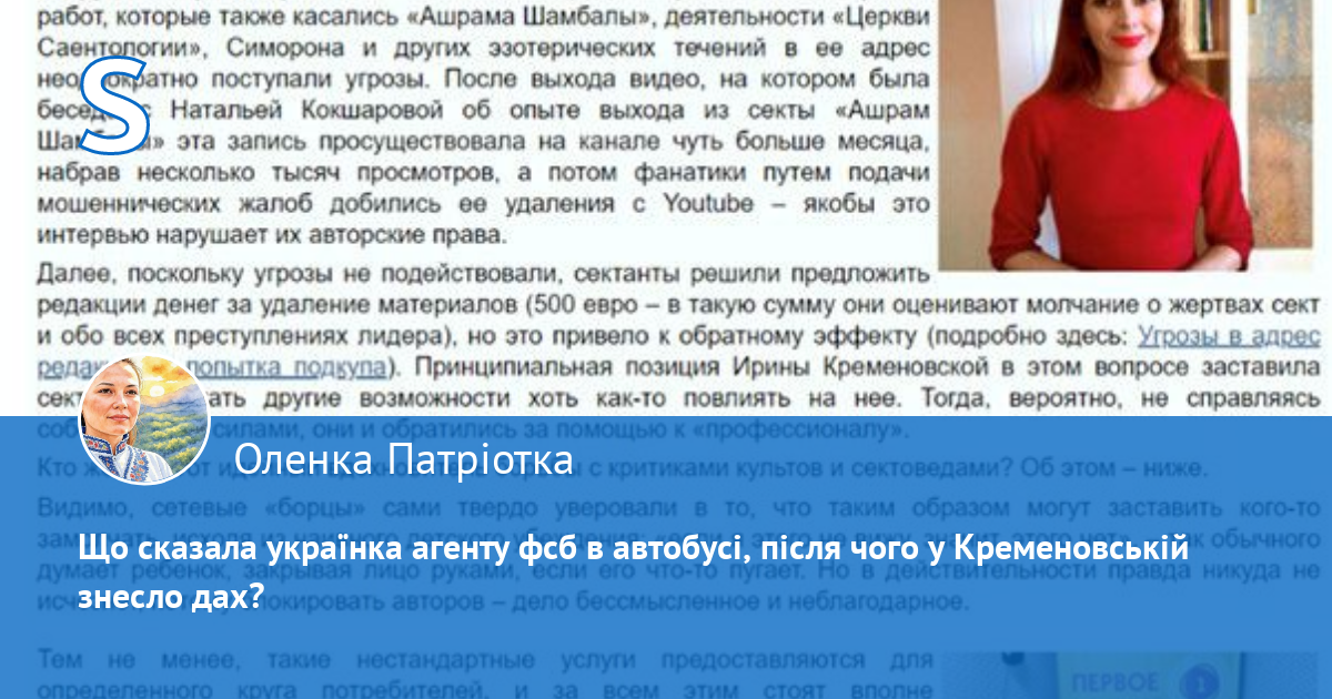 22 жовтня агентка фсб Кременовська в себе на сайті випустила чергову писульку, де знову скиглить і жаліється, що свідома українка в автобусі прямо в обличчя назвала її пособницею рашистів. Не дивно, що жінка це зробила, бо українці вже знають деяких агентів кремля поіменно: Кременовська, Святогор, Бройде.