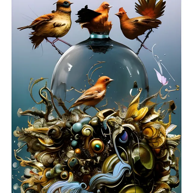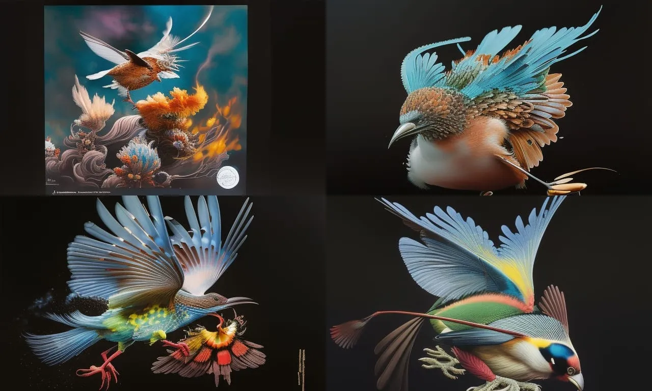Ще один важливий момент, повернемо параметр Overall Prompt Weight 50%, це дасть можливість створювати більш "вільні" генерації. Початкова картинка 1 дала ось такий результат. І це вже несподівані пташки.