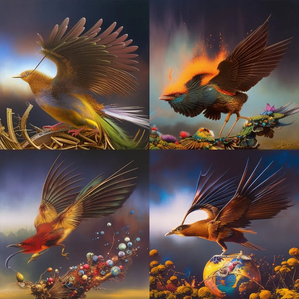 "”Molecular water bird, toxic air bird, liquid fire bird, serendipitous tasseled earth bird" artwork by Jean Baptiste Monge, Alberto Seveso, Camilla D"Errico, Igor Sava, Jamie Hewlett, Michael Divine, Rob Gonsalves, Anton Fadeev, Francoise Nielly, Victo Ngai Epic scale, hyper-detailed, trending on artstation"