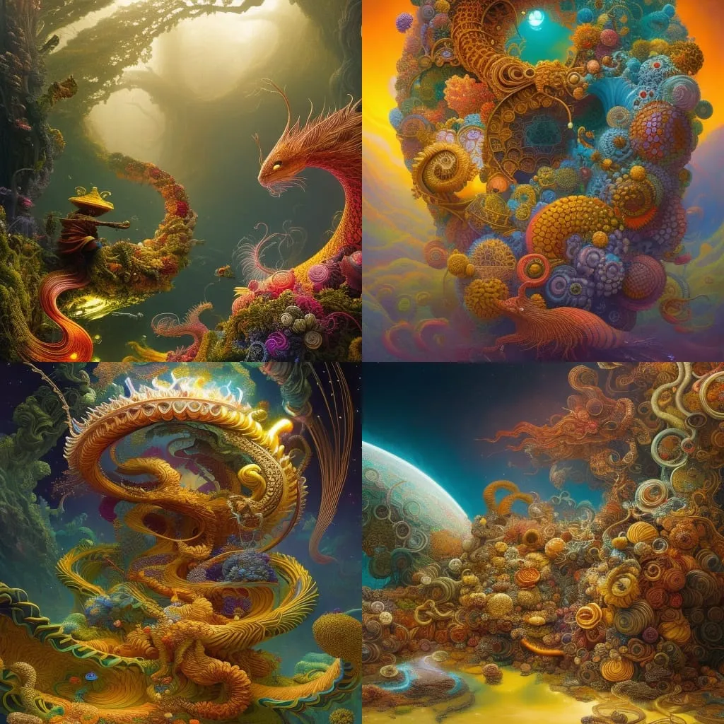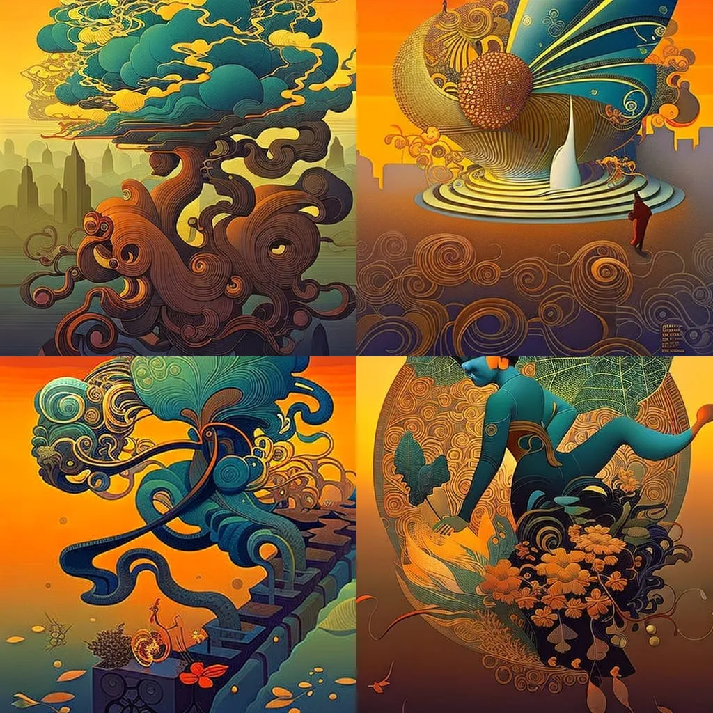 Картинка мені сподобалась своєю «складністю» і переплетенням елементів і я вирішив, що з цим запитом варто попрацювати. Як бачите тут застосовано найпрширеніший метод генерації — мнімальні параметри + 4 вихідні картинки. Власне там була ціла серія картинок схожого змісту і всі вони виглядали фантастично.