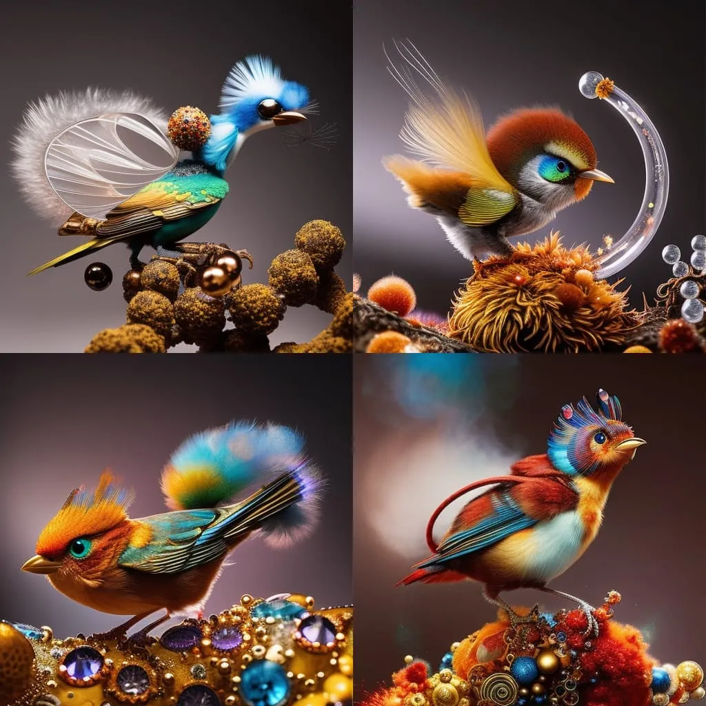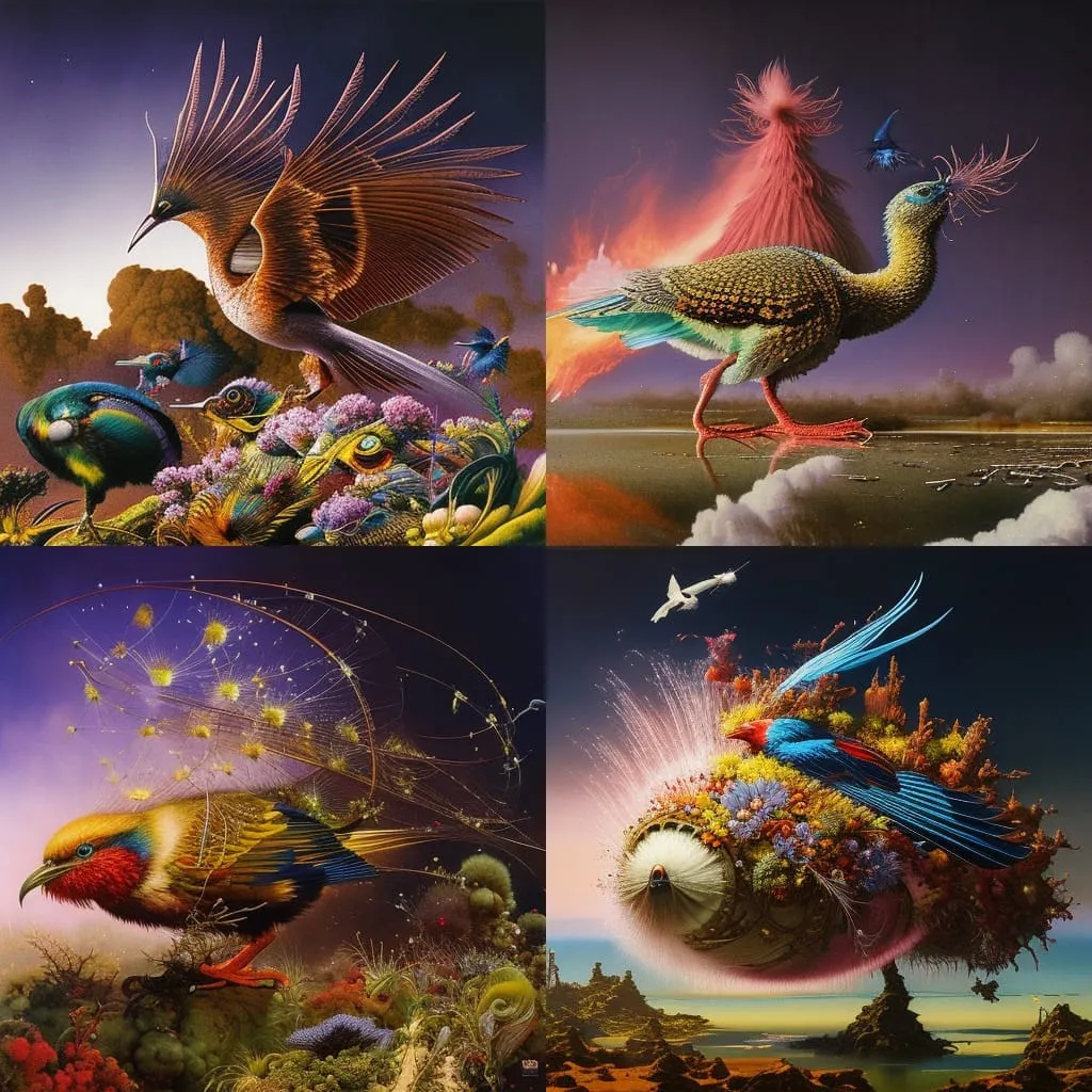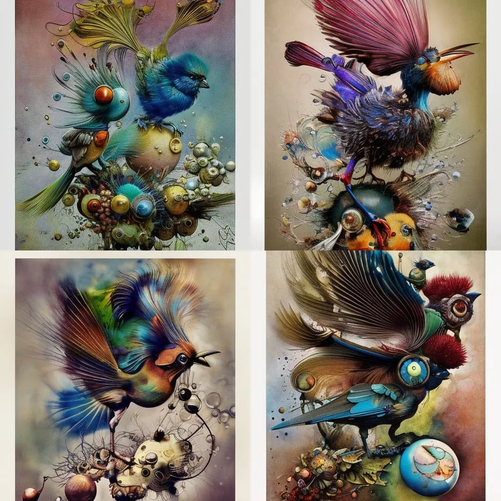 Спробуємо розвинути цей результат. Для розвитку ми скористаємось одною з пташок (права нижня здається найбільш вдалою — в неї пропорції збережені, нормальна голова і кумедна зачіска). Принципово, що ми не змінюємо текст запиту, але змінюємо seed та початкову картинку. Новий результат виглядає так