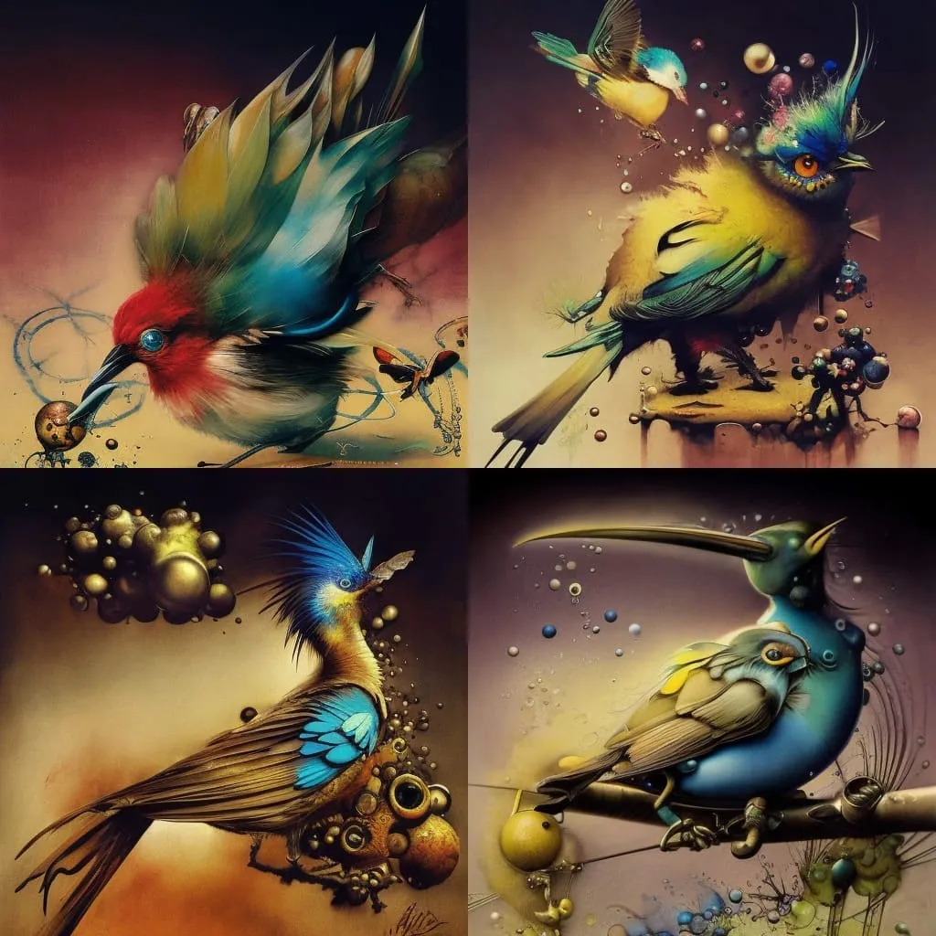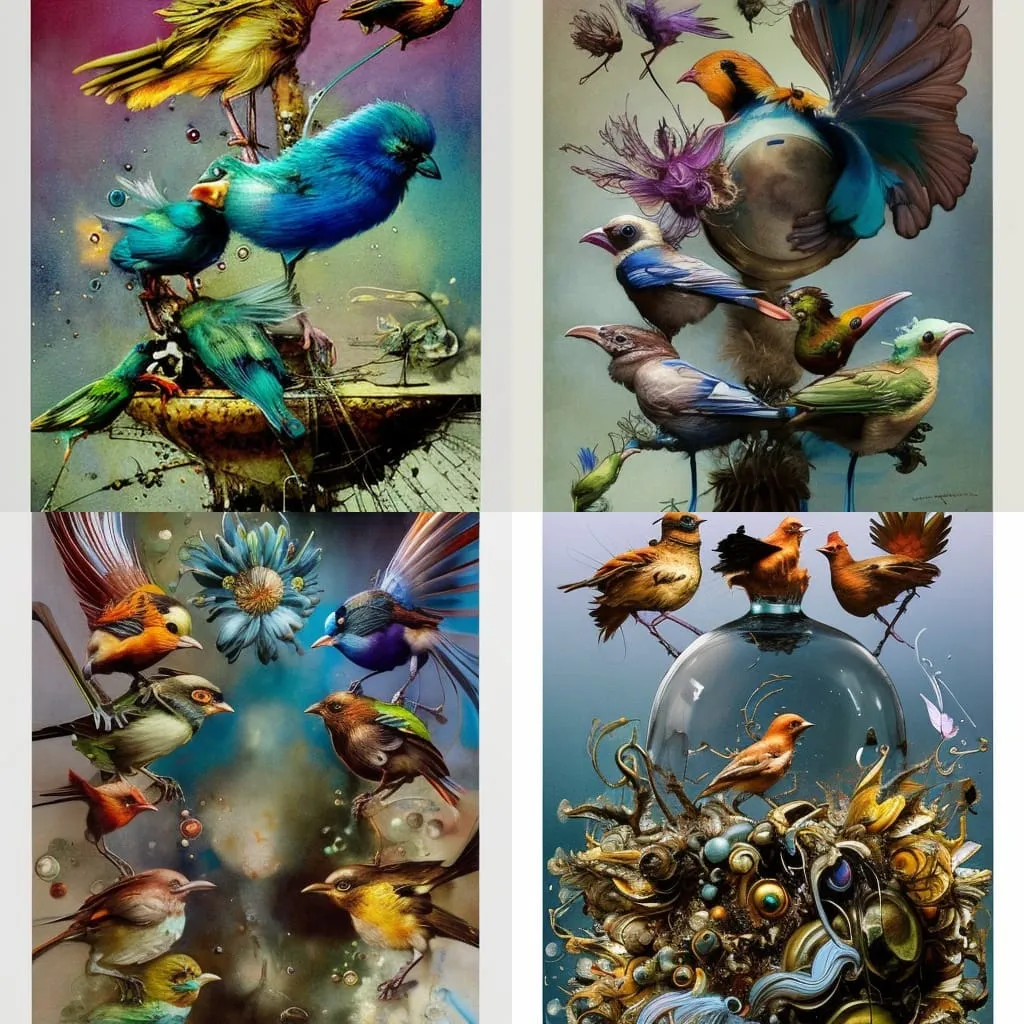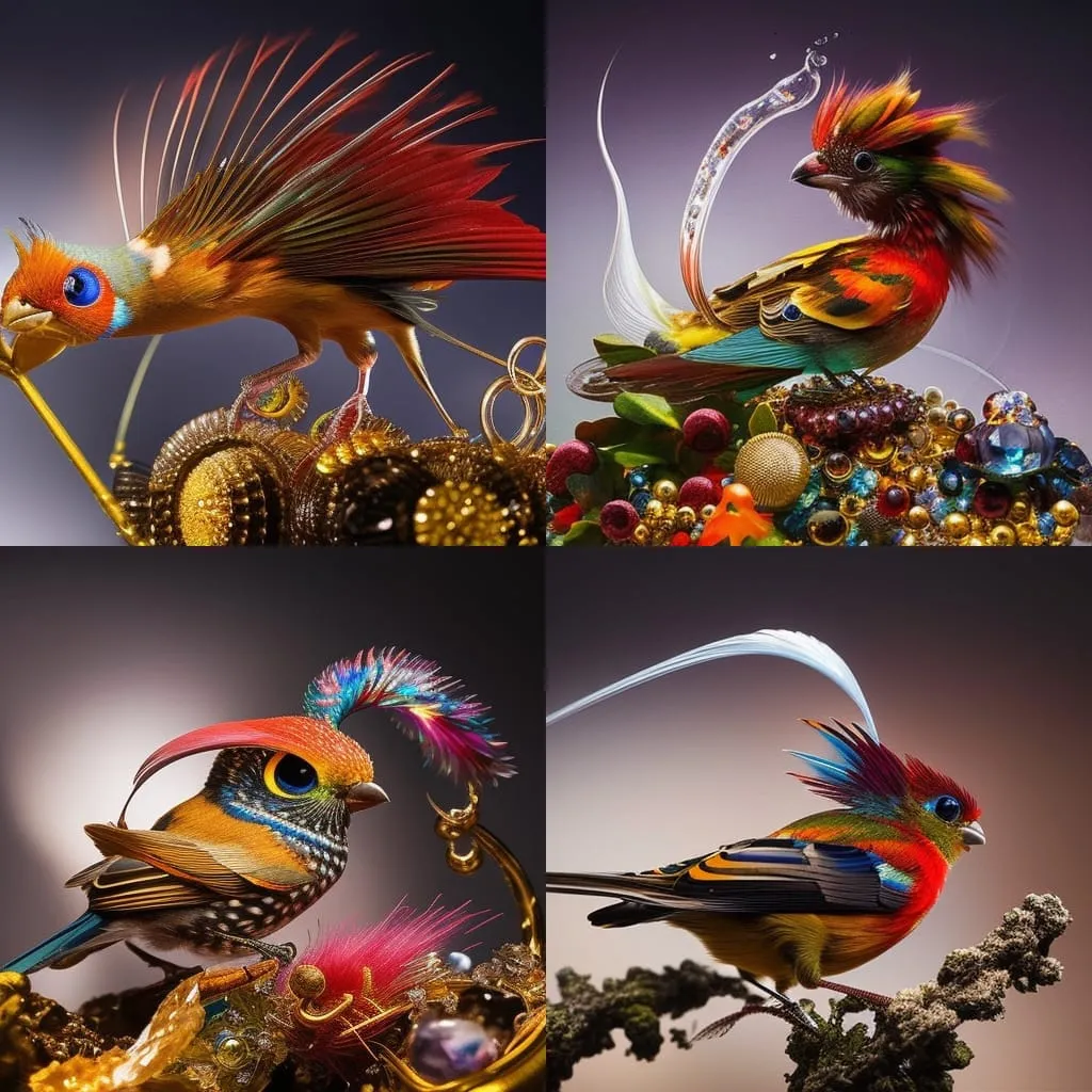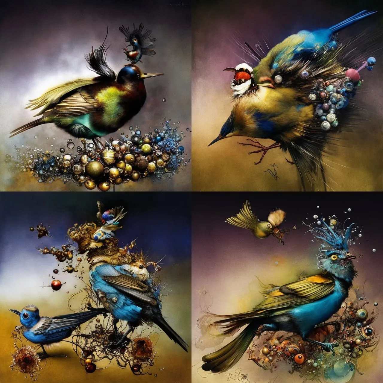 Спробуємо розвинути цей результат. Для розвитку ми скористаємось одною з пташок (права нижня здається найбільш вдалою — в неї пропорції збережені, нормальна голова і кумедна зачіска). Принципово, що ми не змінюємо текст запиту, але змінюємо seed та початкову картинку. Новий результат виглядає так