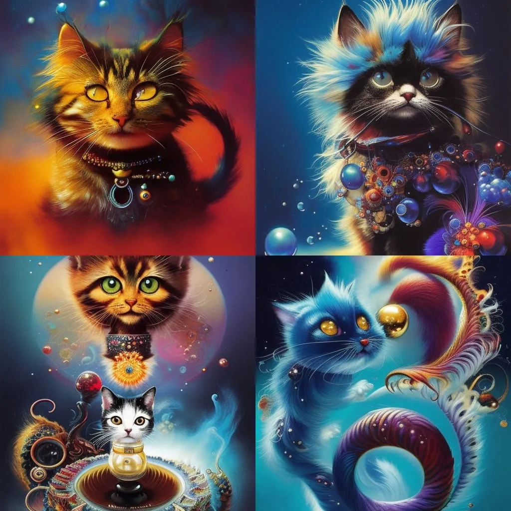 Спробуємо повторити цей результат для котиків. Ідея проста — якщо замінити головне змістовне слово, тоді, як очікується, все буде те саме, але для котів. Ну і зображень котів більше — отже картинка має бути якісніша. Починаємо з Overall Prompt Weight 50%, щоб дати алгоритму більше свободи (ну це я так інтерпретую цей параметр).