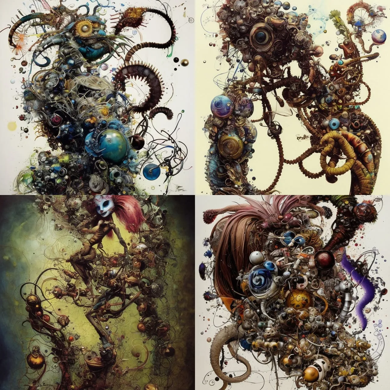 "”Molecular liquid serendipitous hackerpunk tasseled slither!!!!" artwork by Jean Baptiste Monge, Alberto Seveso, Camilla D"Errico, Igor Sava, Jamie Hewlett, Josan Gonzalez, Karol Bak, Michael Divine, Rob Gonsalves, Salvador Dali, Wassily Kandinsky, Anton Fadeev, Francoise Nielly, Epic scale, hyper-detailed, trending on artstation"