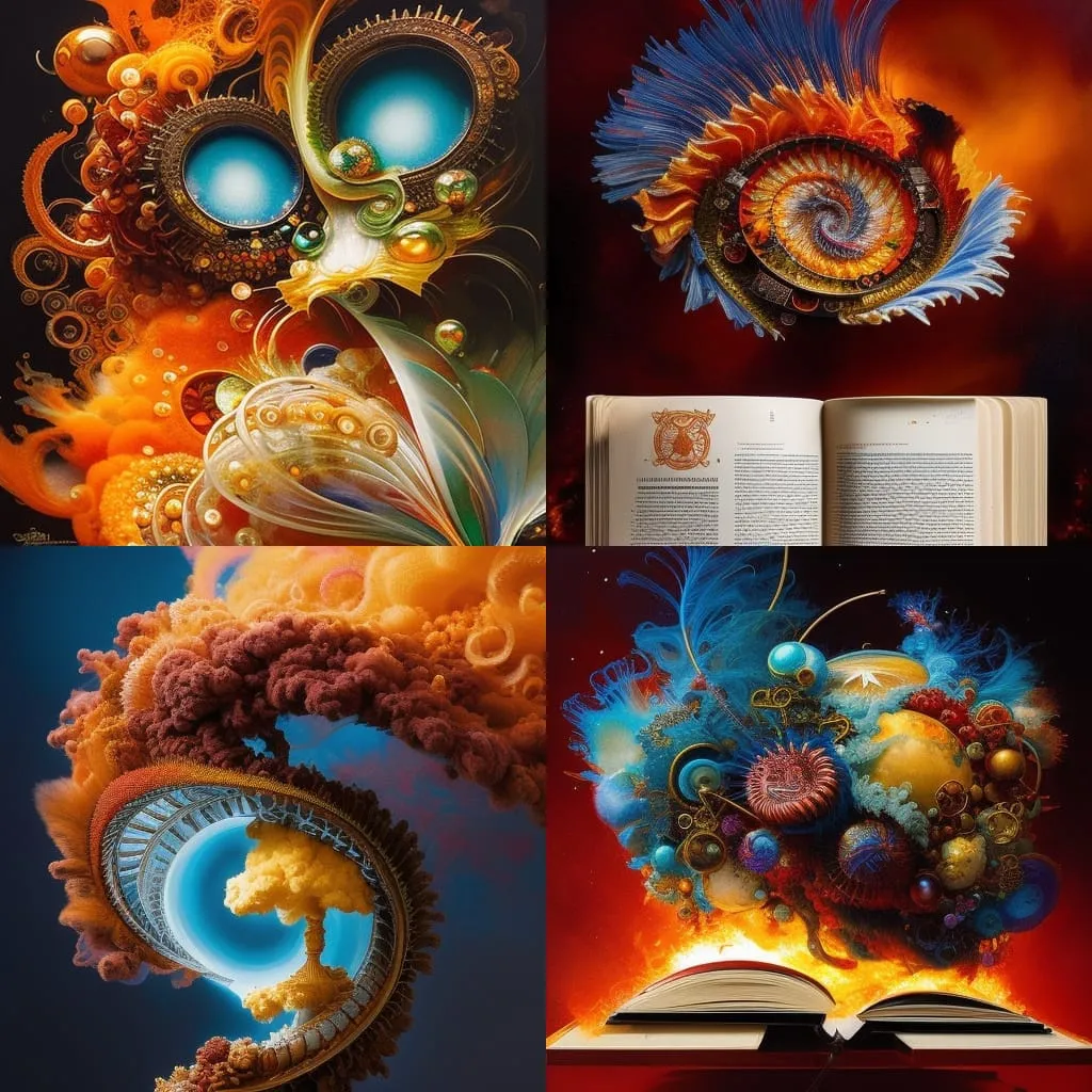 "”Molecular water liquid fire open book in the library, serendipitous tasseled with gems, coils, spirals" artwork by Jean Baptiste Monge, Alberto Seveso, Camilla D"Errico, Igor Sava, Jamie Hewlett, Michael Divine, Rob Gonsalves, Anton Fadeev, Francoise Nielly, Victo Ngai Epic scale, hyper-detailed, trending on artstation"