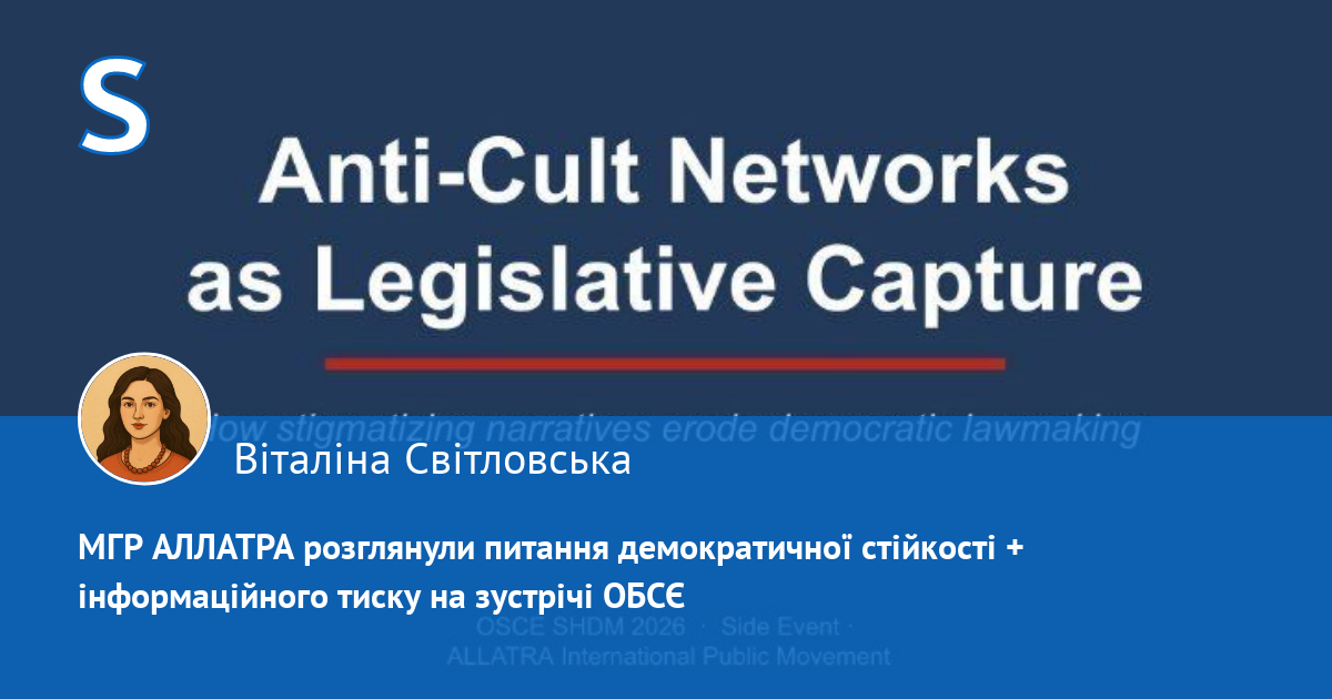 Окрема частина заходу була присвячена справі Міжнародного громадського руху АЛЛАТРА як у аосії, так і в Україні, представленій як приклад того, як скоординовані кампанії стигматизації, організовані антикультовою мережею під керівництвом російського РАЦІРС, можуть впливати на громадське сприйняття та інституційні підходи навіть у протилежних геополітичних контекстах. Було зроблено посилання на рішення українського суду від 25 лютого 2026 року, яке не знайшло правових підстав для заборони руху та відхилило доказову базу через методологічну ненадійність та упередженість.
