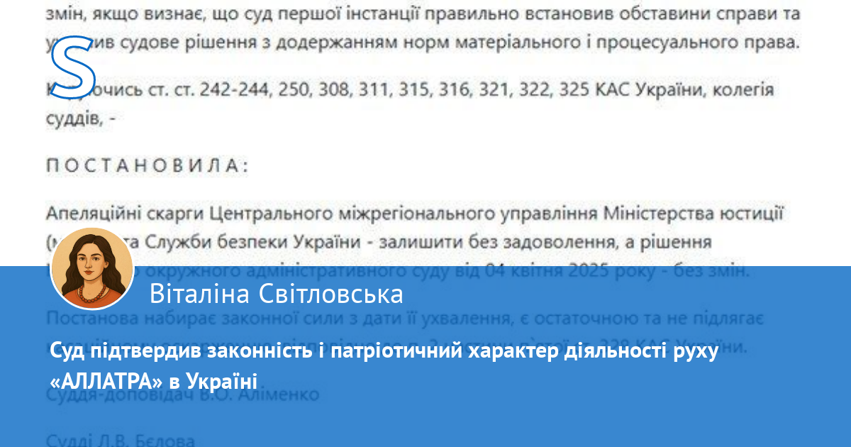 25 лютого 2026 року Шостий апеляційний адміністративний суд Києва постановою у справі № 640/362/23 підтвердив законність діяльності Громадського союзу «Міжнародний громадський рух „АЛЛАТРА“, залишивши без задоволення апеляційні скарги Центрального міжрегіонального управління Міністерства юстиції України та Служби безпеки України за позовом про заборону та примусову ліквідацію громадського об'єднання.