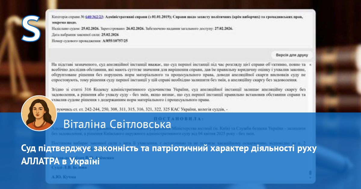 25 лютого 2026 року Шостий апеляційний адміністративний суд (Київ, Україна) підтвердив законність діяльності Громадського об'єднання «Міжнародний громадський рух АЛЛАТРА», встановивши відсутність будь-яких законодавчих підстав для його заборони та примусової ліквідації.
