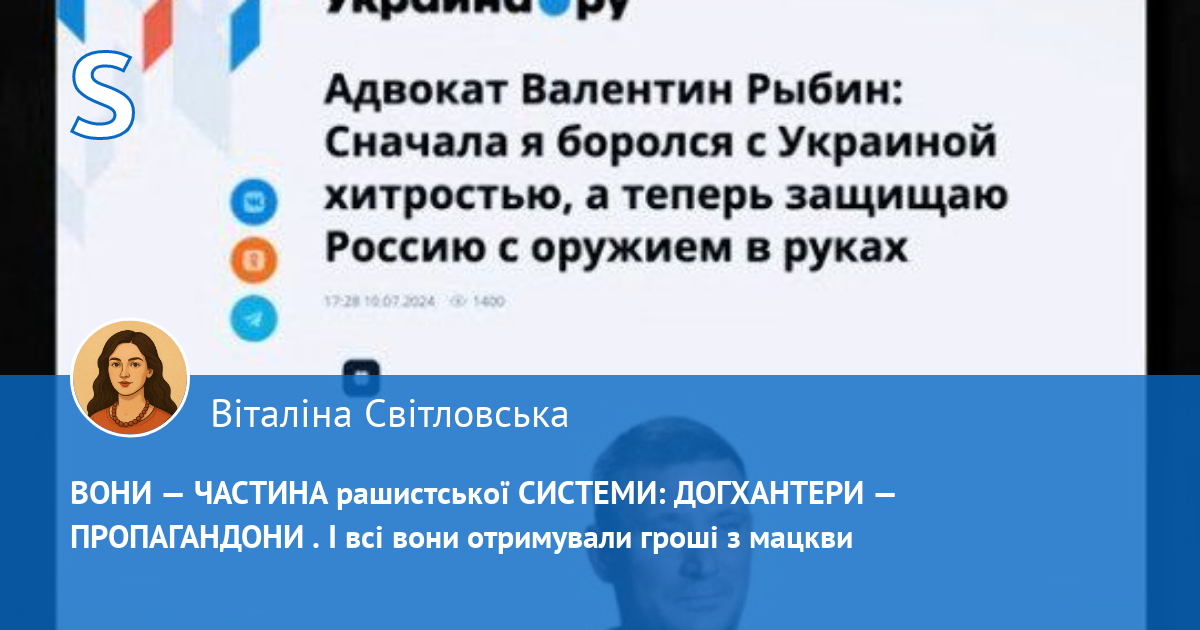 Адвокат Валентин Рибін: «Спочатку я боровся з Україною хитрістю, а тепер захищаю Росію зі зброєю в руках. Я відразу ж після державного перевороту в 2014 році визначився, на чиєму я боці„, — зауважив він, коментуючи події у 2014 році в Україні. Хитрістю Рибіна в боротьбі з Україною є не лише інформаційні війни, які він веде з 2022 року, перебуваючи в рф, а й діяльність безпосередньо на території України. Рибін сказав: «З 14-го по 22-й рік у мене навіть в Україні, навіть у Києві були люди, які досить активно підтримували і мою позицію щодо тих хлопців, яких я захищав, і активно не погоджувалися з тим офіційним курсом, який проводила Україна.»