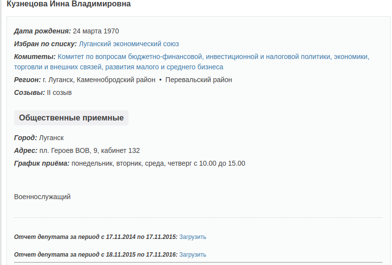 Впрочем, на украинских сайтах, разбиравших эту ситуацию, сразу отметили то, что Кузнецова и Кривоносов не только поддерживали интимные связи, но и были ближайшими подручными лично Плотницкого по распилу и откату еще со времен „батальона «Заря», где оба начинали «тыловиками и финансистами». Попав в «народный совет», Кузнецова и Кривоносов также возглавили комитеты по бюджетно-финансовым и земельно-имущественным вопросам. Покойные «парламентарии» были весьма близки к Плотницкому, в том числе и вопросах добычи и торговли углем, распределения содержимого «гумконвоев» и средств на счетах «госбанка ЛНР».