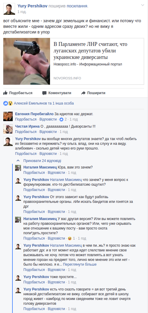 В перепалку с Першиковым практически сразу включилась одиозная Наталья Максимец — бывший главред «Советской Луганщины» и идейная «республиканка». Их переписка в стиле «сам дурак» интересна, безусловно, не содержанием, а просто фактом своего существования. Максимец топит за версию ДРГ, Першиков ехидно ухмыляясь, намекает, что это банальные бандитские разборки.