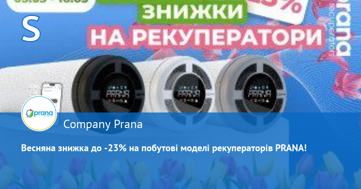 З 5 по 16 березня 2026 року ви можете придбати побутові моделі рекуператорів PRANA із знижкою до -23%. Це чудова можливість подбати про якісний повітрообмін у квартирі чи будинку, створити комфортний мікроклімат та підготуватися до періоду активного цвітіння й сезонних алергій