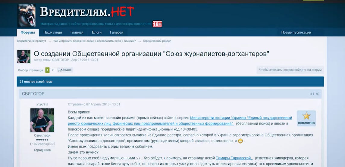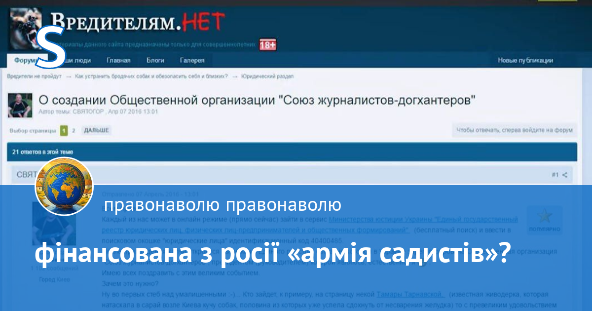 Це ніколи не було просто про «жагу до крові» окремих виродків. Їх навіть людьми важко назвати. З цього все лише починалося…Згодом прихильники руху з'явилися і в Україні. Думаєте, просто тому, що ми сусіди? Ні. Це була чітка, холодна стратегія: знайти найбільш нестабільних, лютих і озлоблених людей, об'єднати їх, накачати ненавистю і навчити діяти спільно. Тотальна жорстокість, відчуття повної безкарності та агресія до всіх, хто проти. Нічого не нагадує?У квітні 2016 року Олексій Святогор та Ірина Кременовська стали засновниками громадської організації «Союз журналістів-догхантерів»