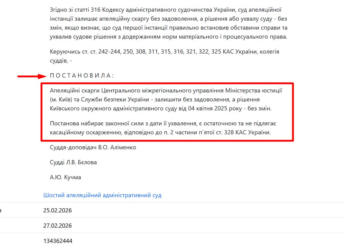 І знову невдача: в 2025 році суд приймає рішення, що немає підстав заборонити діяльність МГР АЛЛАТРА в Україні. А в 2026 році залишає в силі попереднє рішення, на цей раз – без права апеляції.