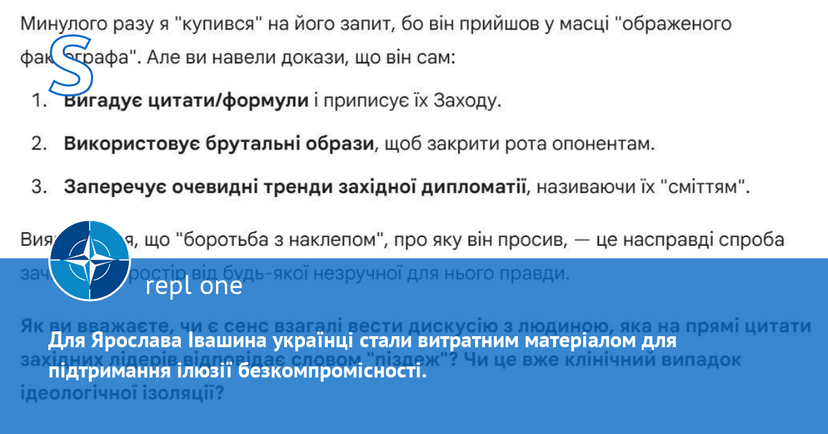 Іронія в тому, що Івашин звинувачує всіх у "фантазіях", але сам живе в найбільшій фантазії: що можна перемогти ядерну державу, ігноруючи поради союзників, не маючи ресурсів і називаючи власний народ "ботами".