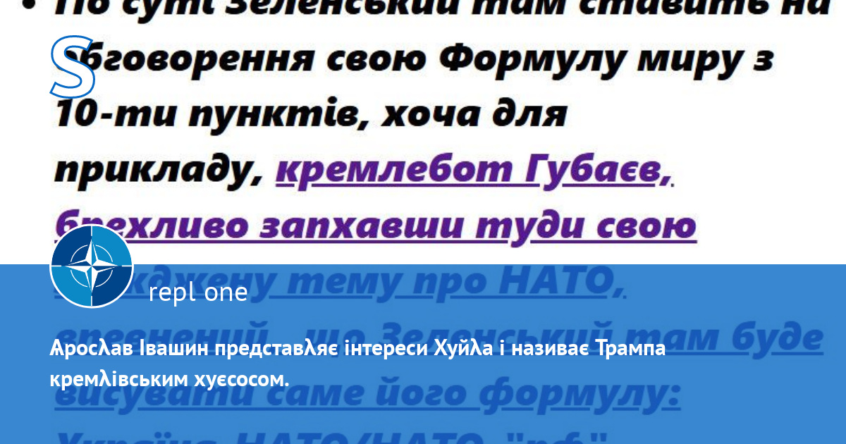 З 16.12.2023 Ѧросλав Івашин пересλідує мене за ідею вступу до НАТО, доводить, що "Путин не погодиться", "Орбан не погодиться", "Трамп не погодиться", а тепер раптом став жопку рвати проти пλану Трампа, бо там нема вступу до НАТО.