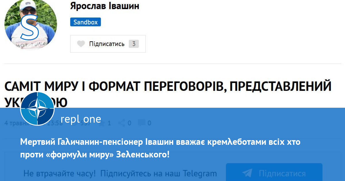 Маніпулюючи, як завжди, фактами, агент кремля придумав, ніби Зеленський долучився до його ботоферми і показав це у назві своєї теми: Зеλенський приєднався до ботоферми repl one та підтримав перемир'я в форматі Україна-НАТО/НАТО-"рф".