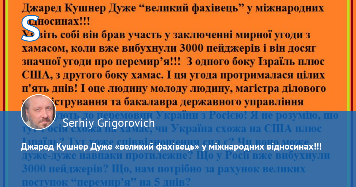 Джаред Кушнер Дуже «великий фахівець» у міжнародних відносинах!!!Уявіть собі він брав участь у заключенні мирної угоди з хамасом, коли вже вибухнули 3000 пейджерів і він досяг значної угоди про перемир'я!!! З одного боку Ізраїль плюс США, з другого боку хамас. І ця угода протрималася цілих п'ять днів! І оце людину молоду людину, магістра ділового адміністрування та бакалавра державного управління підтягують до перемовин України з Росією! Я не розумію, що тут Росія схожа на хамас, чи Україна схожа на США плюс Ізраїль? Тут хоже співвідношення сил є? Чи воно може дуже-дуже навпаки протилежне? Що у Росії вже вибухнули 3000 пейджерів? Що нам потрібно за рахунок великих поступок «перемир'я» на 5 днів?