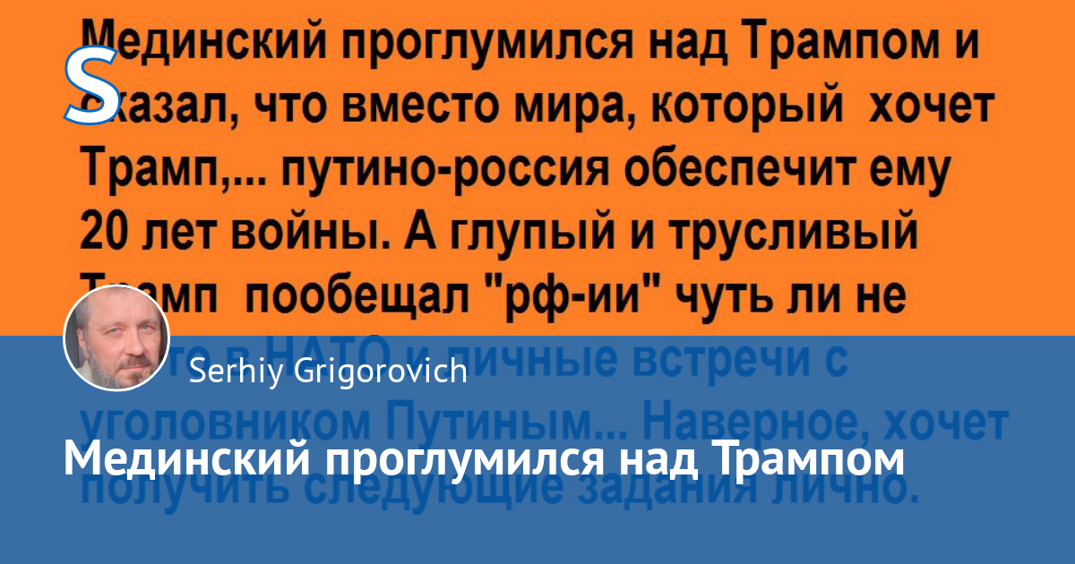 Мединский проглумился над Трампом и сказал, что вместо мира, который хочет Трамп,... путино-россия обеспечит ему 20 лет войны. А глупый и трусливый Трамп пообещал «рф-ии» чуть ли не место в НАТО и личные встречи с уголовником Путиным... Наверное, хочет получить следующие задания лично.