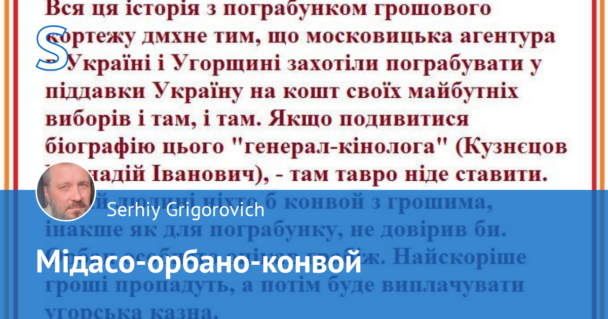 Вся ця історія з пограбунком грошового кортежу дмхне тим, що московицька агентура в Україні і Угорщині захотіли пограбувати у піддавки Україну на кошт своїх майбутніх виборів і там, і там. Якщо подивитися біографію цього «генерал-кінолога» (Кузнєцов Геннадій Іванович), — там тавро ніде ставити. Такій людині ніхто б конвой з грошима, інакше як для пограбунку, не довірив би. Орбан особисто опікав грабіж. Найскоріше гроші пропадуть, а потім буде виплачувати угорська казна.