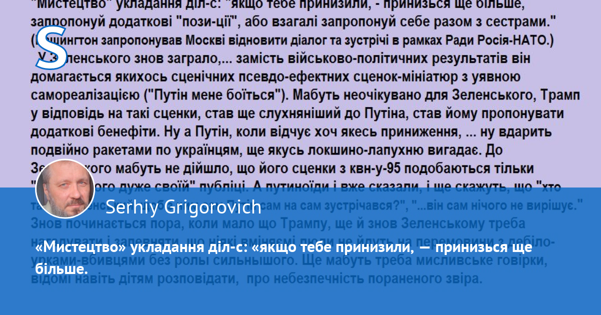 У Зеленського знов заграло,... замість військово-політичних результатів він домагається якихось сценічних псевдо-ефектних сценок-мініатюр з уявною самореалізацією ("Путін мене боїться"). Мабуть неочікувано для Зеленського, Трамп у відповідь на такі сценки, став ще слухняніший до Путіна, став йому пропонувати додаткові бенефіти. Ну а Путін, коли відчує хоч якесь приниження, ... ну вдарить подвійно ракетами по українцям, ще якусь локшино-лапухню вигадає. До Зеленського мабуть не дійшло, що його сценки з квн-у-95 подобаються тільки "певній, його дуже своїй" публіці. А путиноїди і вже сказали, і ще скажуть, що "хто такий Зеленський, щоб з ним сам Путін сам на сам зустрічався?", "...він сам нічого не вирішує."