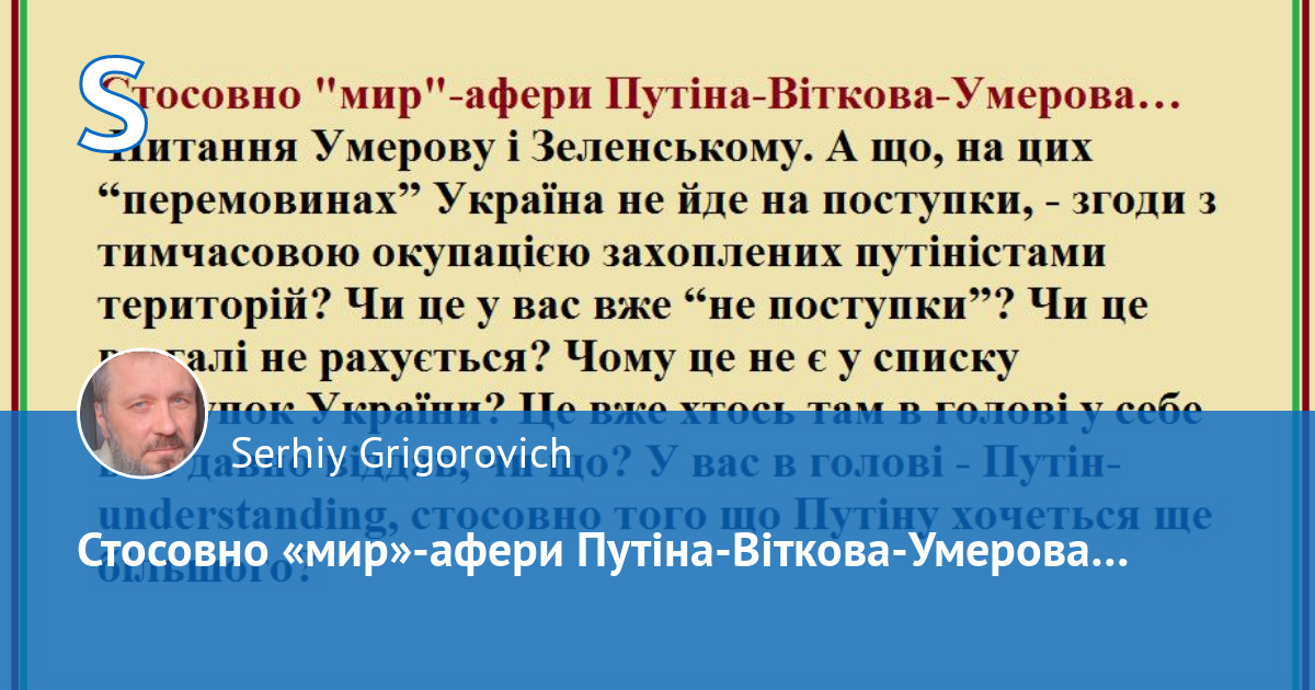 Стосовно «мир»-афери Путіна-Віткова-Умерова… Питання Умерову і Зеленському. А що, на цих «перемовинах» Україна не йде на поступки згоди з тимчасовою окупацією захоплених путіністами територій? Чи це у вас вже «не поступки»? Чи це взагалі не рахується? Чому це не є у списку поступок України? Це вже хтось там в голові у себе вже давно віддав, чи що? У вас в голові — Путін-understanding, стосовно того що Путіну хочеться ще більшого?
