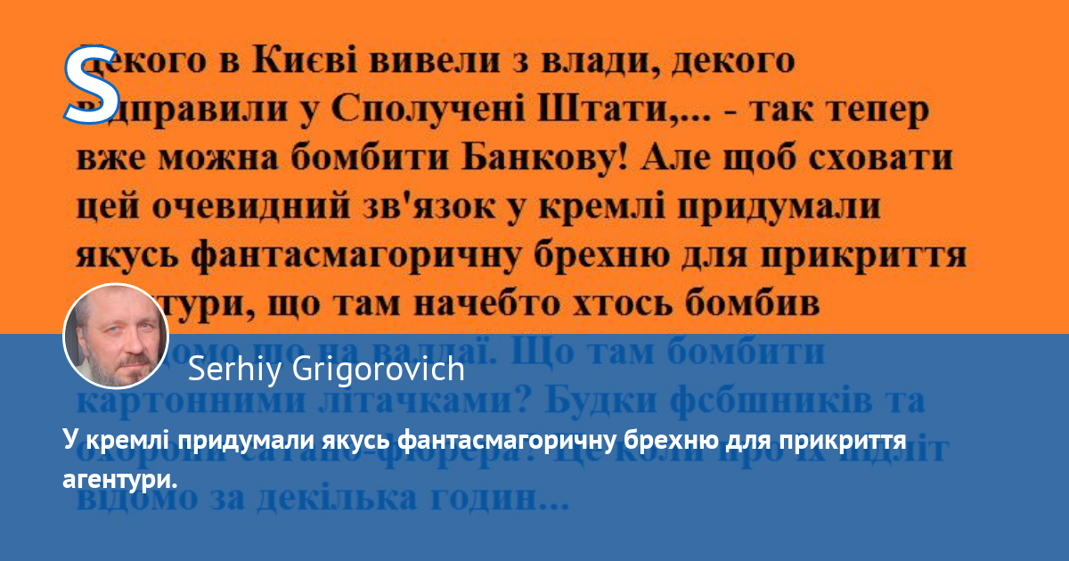 Декого в Києві вивели з влади, декого відправили у Сполучені Штати,... — так тепер вже можна бомбити Банкову! Але щоб сховати цей очевидний зв'язок у кремлі придумали якусь фантасмагоричну брехню для прикриття агентури, що там начебто хтось бомбив невідомо що на валдаї. Що там бомбити картонними літачками? Будки фсбшників та охорони сатано-фюрера? Це коли про їх підліт відомо за декілька годин...